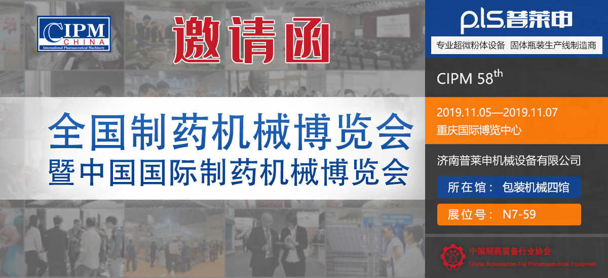 第58屆(2019年秋季)全國製藥機械暨中國國際製藥機械博覽會將於2019年11月05日至11月07日在重慶國際博覽中心舉行。該博覽會曾連續被中華人民共和國商務部列為重點支持展會之一, 是業界公認的專業化、國際化、規模大、展品全、觀眾多,集貿易、研討於一體的製藥裝備行業交流平台。