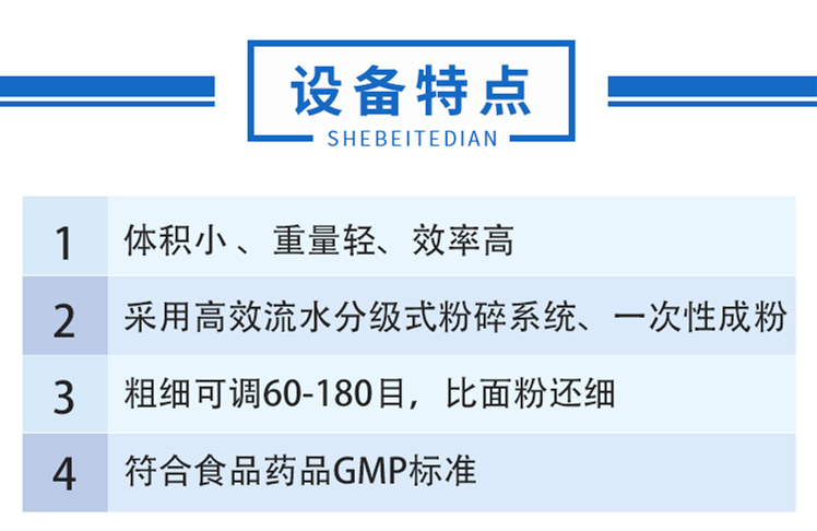 一是粉碎效率高。對於任何纖維狀、高韌性、高硬度及含水量小於6%的物料均可適應,能耗低、溫度低,避免發生物料高溫氧化、變質和有效成分的損失和偏析。粉碎過程全密閉無粉塵溢出,充分改善作業環境。適於中心粒徑為150目〜10000目(1.3μm)的粉碎要求,使用特殊工藝時可達1〜0.1μm 。對花粉、靈芝孢子粉等孢子類要求打破細胞壁的物料,其破壁率高於95%。
