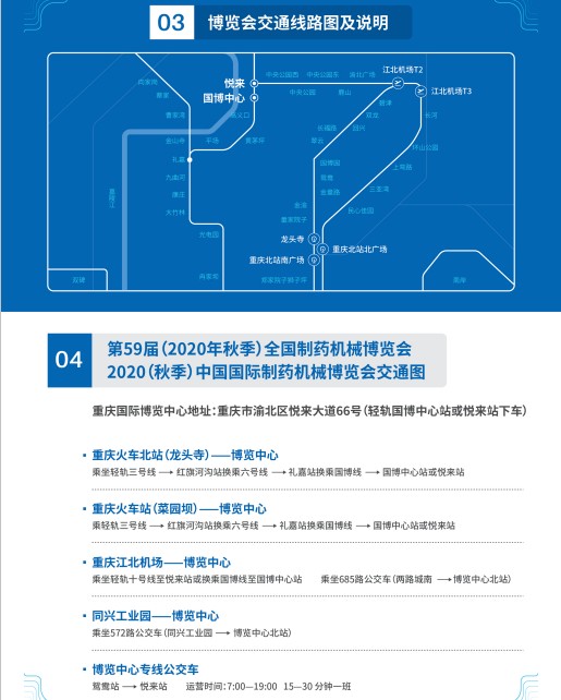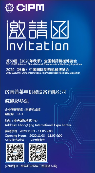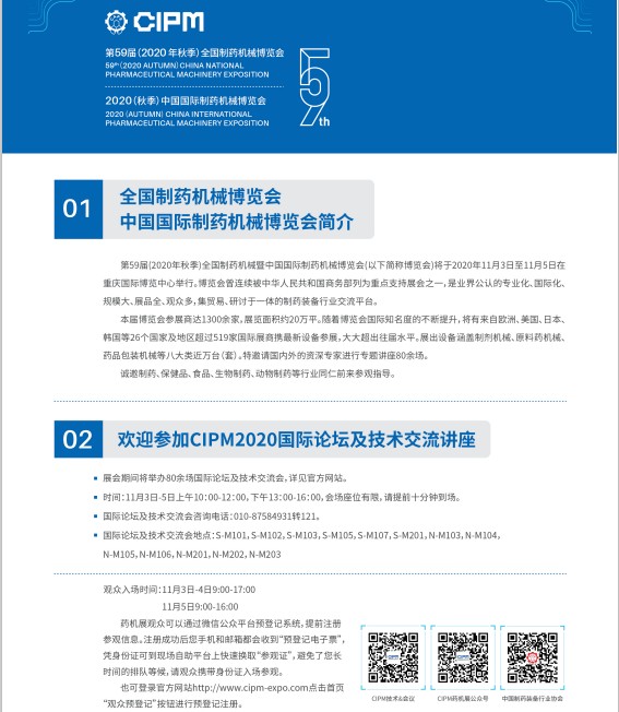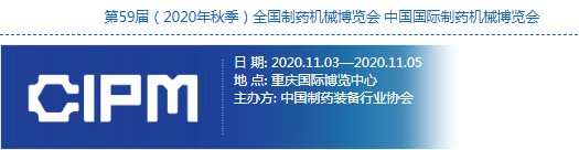 第59屆(2020年秋季)全國製藥機械暨中國國際製藥機械博覽會將於2020年11月03日至11月05日在重慶國際博覽中心舉行。該博覽會曾連續被中華人民共和國商務部列為重點支持展會之一, 是業界公認的專業化、國際化、規模大、展品全、觀眾多,集貿易、研討於一體的製藥裝備行業交流平台。
