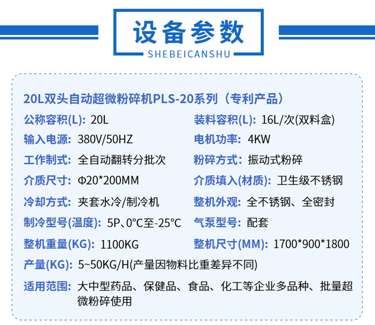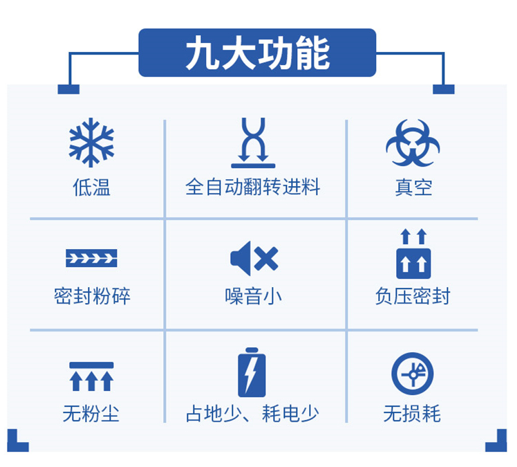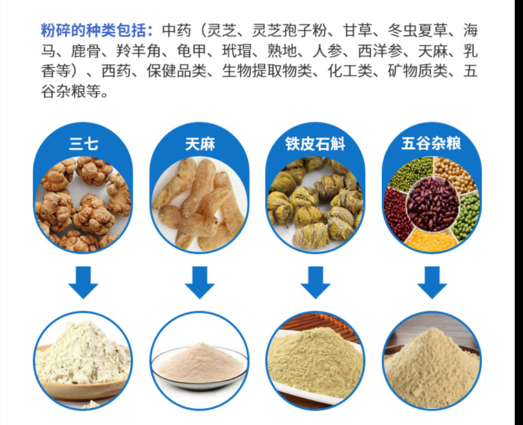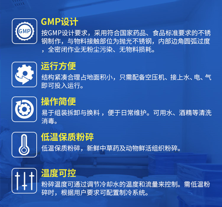同時該設備的特點包含1. GMP設計  按GMP設計要求,采用符合國家藥品、食品標準要求的不鏽鋼製作,與物料接觸部位為拋光不鏽鋼,內部邊角圓弧過度,全密閉作業無粉塵汙染、無物料損耗。2. 運行方便  結構緊湊合理占地麵積小,隻需配備空壓機、接上水、電、氣即可投入運行。3. 操作簡便  易於組裝拆卸與換料,便於日常維護。可用水、酒精等清洗消毒。4. 低溫保質粉碎  低溫保質粉碎,新鮮中草藥及動物鮮活組織粉碎。5. 溫度可控  粉碎溫度可通過調節冷卻水的溫度和流量來控製。需低溫粉碎時,根據用戶要求可配置製冷係統